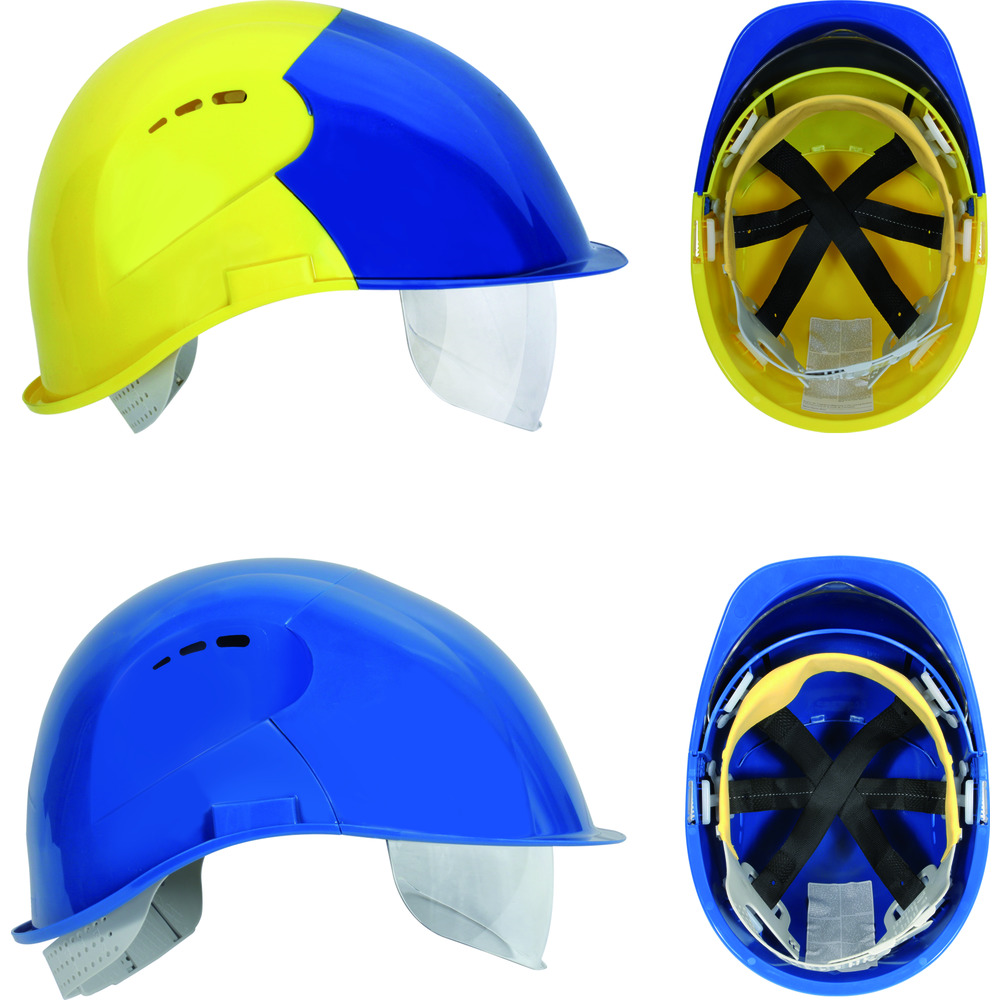 • beskyttelseshjelm af polyethylen efter EN 397 med integreret visir af polycarbonat efter EN 166 med ridsefast belægning på begge sider