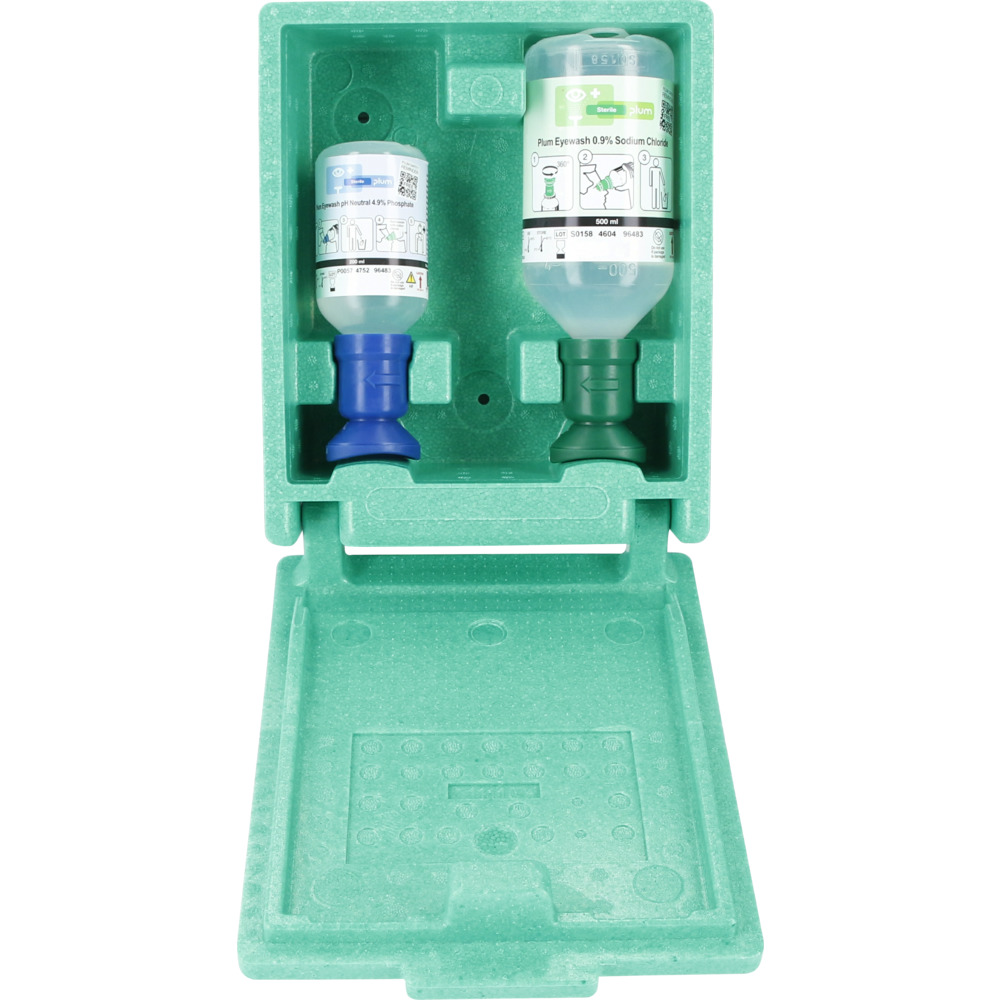 • Indhold: 1× 200 ml fosfatopløsning (art. nr. 5409 33) og 1× 500 ml natriumkloridopløsning (art. nr. 5409 32) med piktogramtavle Øjenskyller med spejl