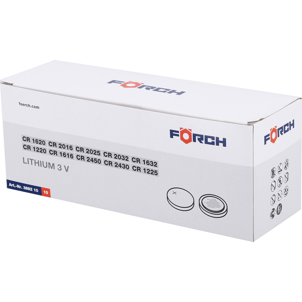 • 1 blister af hver CR1220, CR1225, CR1620, CR1632, CR2016, CR2025, CR2032, CR2430, CR2450